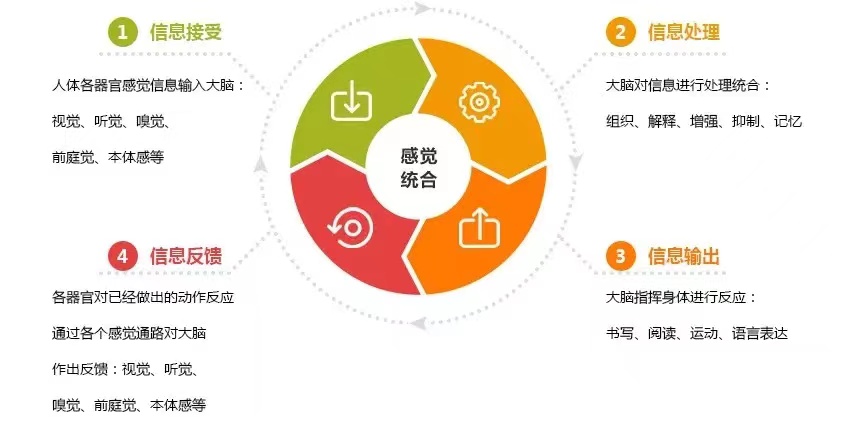 感覺統(tǒng)合是指大腦和身體相互協(xié)調(diào)的學(xué)習(xí)過程,是指機(jī)體在環(huán)境內(nèi)有效利用自己的感官,以不同的感覺通路 (視覺、聽覺、味覺、嗅覺、觸覺、前庭覺和本體覺等)